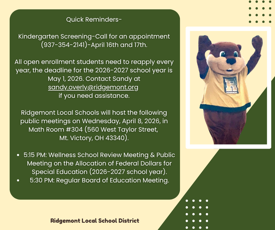 Ridgemont Local Schools will create partnerships with our families and community which broaden minds to learn and serve through collaboration, innovation, and rigorous academics for life’s learning journey.